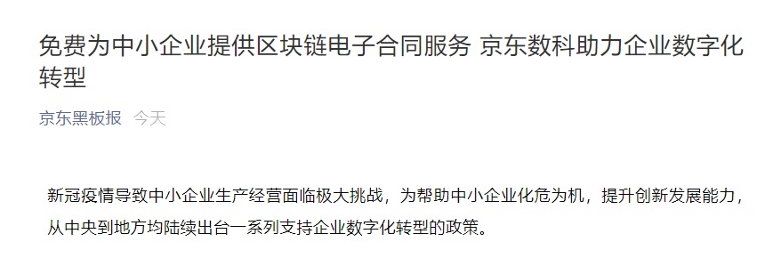 7月14日消息 根据京东的消息,京东数科在区块链领域推出了两项举措,一是发布“普惠云签”计划扶持中小企业,面向全国中小企业提供免费的区块链电子合同签约云服务,解决传统合同面临的成本高、低时效、易造假等难题;二是利用区块链信用流转平台,帮助中小微企业获得更便利的融资服务,缓解疫后资金压力。