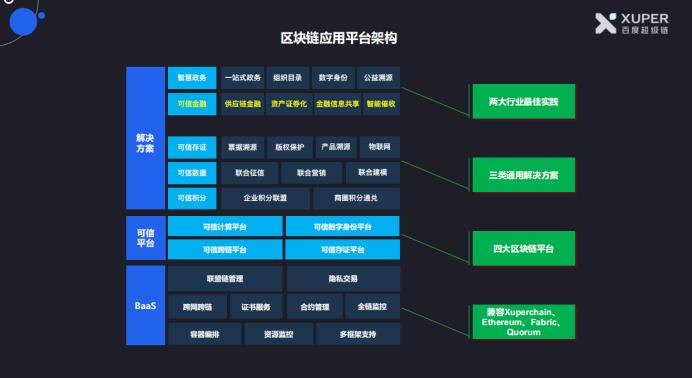 为满足不同领域企业用户的各种需求,百度超级链提供了五大区块链服务平台,包括区块链即服务平台BaaS,以及四大可信平台分别为:可信计算平台、可信数字身份平台、可信跨链平台以及可信存证平台。