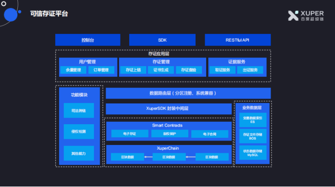 可信存证平台应用层分为用户管理、存证管理以及证据服务;功能模块可分为司法跨链、侵权检测等功能,支持文档、图片、视频、电子合同等多种类型数据直接上传存证、SDK调用两种方式。