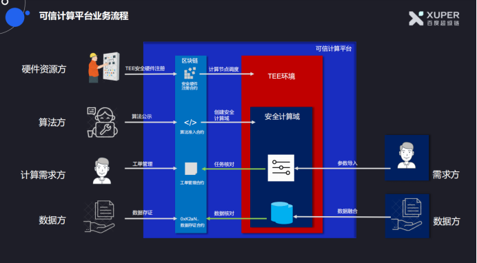 可信计算平台基于可信软硬件及区块链技术,可以保证在企业数据安全和隐私保护的前提下完成多方数据协同计算。