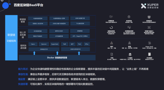其中,百度区块链BaaS平台⽀持将BBE区块链BaaS平台进⾏私有化部署,并提供更专业的Bproxy、网络中间层、链网监控、可视化运维等功能。同时结合客户业务场景,甄选最合适的共识机制和底层框架,搭建完全适配业务场景的智能合约、Dapp系统。并提供基于MesaTee的软硬件一体的⾦融级数据隐私保护、数据多⽅安全计算的方案可供选择。